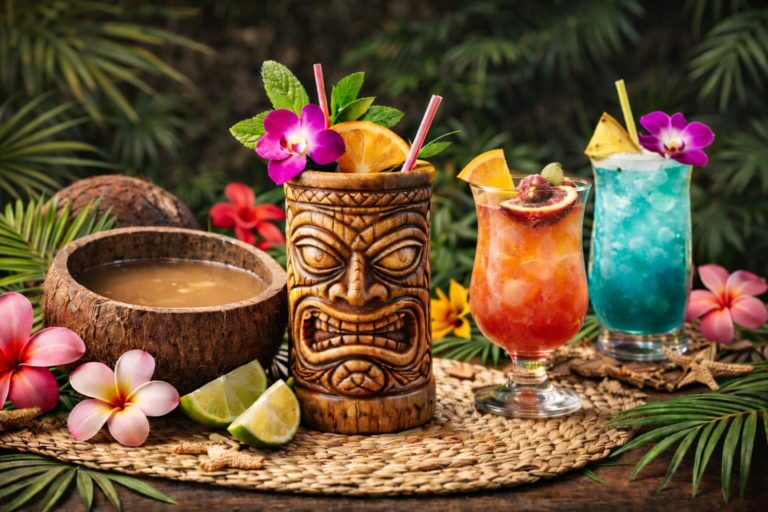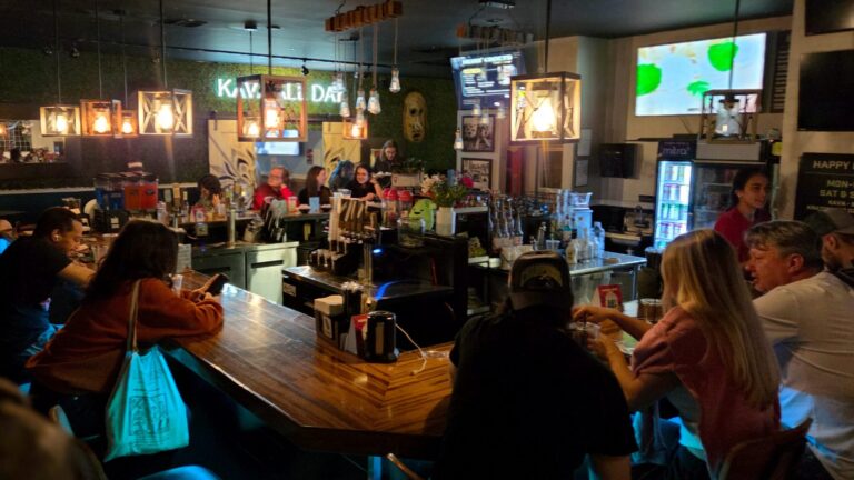 Relaxed kava bar serving kava drinks and teas in a Polynesian-style lounge with a homey…