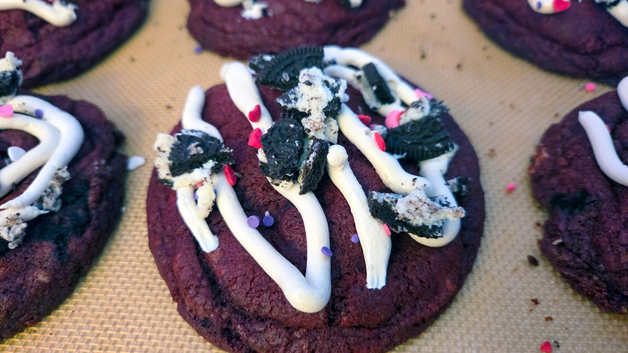 A soft, fudgy red velvet cookie with a deep cocoa flavor and subtle tang, finished with a smooth cream cheese frosting that melts into the surface. Crushed Oreo pieces add light crunch and pockets of creaminess, while the cookie itself stays tender with gently set edges. Rich without being heavy, sweet with a slight tang, and balanced from first bite to last.